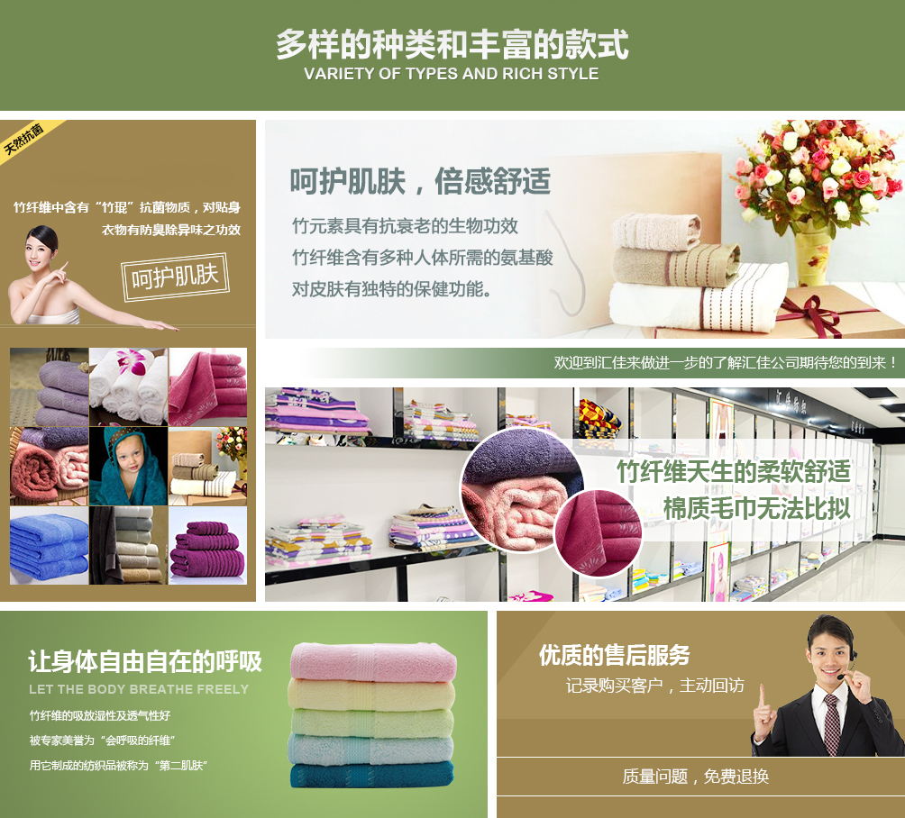 德州匯佳紡織品有限公司專(zhuān)業(yè)生產(chǎn)竹纖維毛巾,是竹纖維毛巾品牌廠家,并且提供竹纖維毛巾禮盒套裝用于福利和禮品。公司座落于山東德州,交通十分便利,公司近臨京滬高速公路,距離德州火車(chē)站、汽車(chē)站10公里京滬高鐵5公里,濟(jì)南國(guó)際機(jī)場(chǎng)120公里。